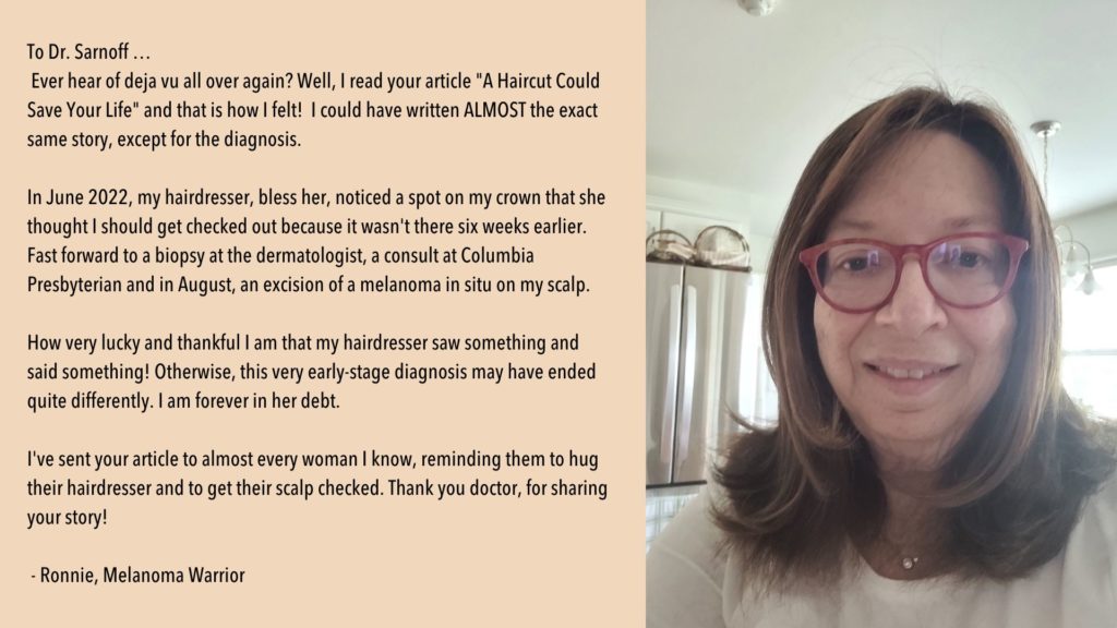 As her hairdresser parted Ronnie’s hair for a cut, she saw something – a spot — on Ronnie’s scalp that wasn’t there six weeks earlier. “It was not in a place I would easily see myself, but she definitely felt it was something I should have checked out,” Ronnie explains.