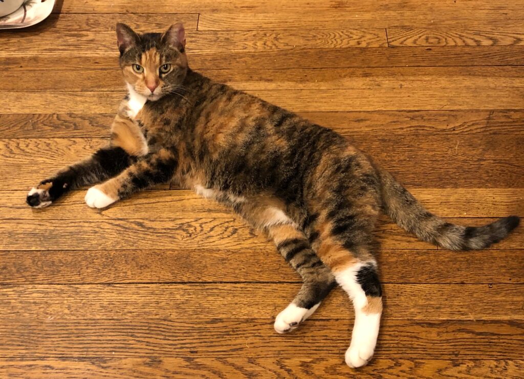 Polly was a lucky cat to land with me back in November 2018. A friend was driving a country road in the Catskills of New York when he spotted a small tortoiseshell cat among the trees. Kindhearted George pulled over, opened the car door and she jumped right in! Clearly, she’d been someone’s pet, but now she was lost and needing a home.