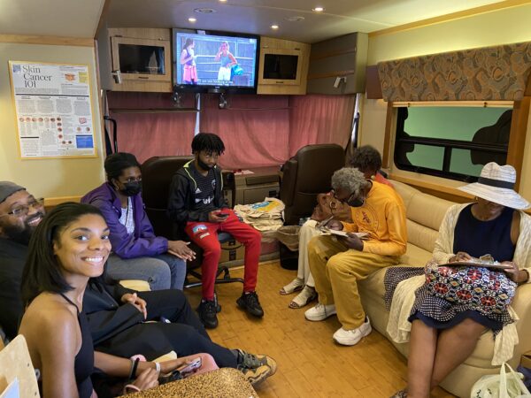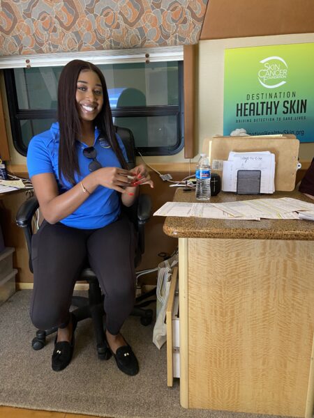 We parked at 191 Peachtree Tower on a warm Thursday morning at the end of May. The event team set up the RV for a day of lifesaving screenings with our volunteer dermatologist Titilola Sode, MD. Dr. Sode performed 21 skin cancer screenings over six hours of screening. Some of our screeners included building employees, street traffic goers and a couple that saw us on the news the day before. We also met participants who knew us from last year and many new ones who had never been screened before.