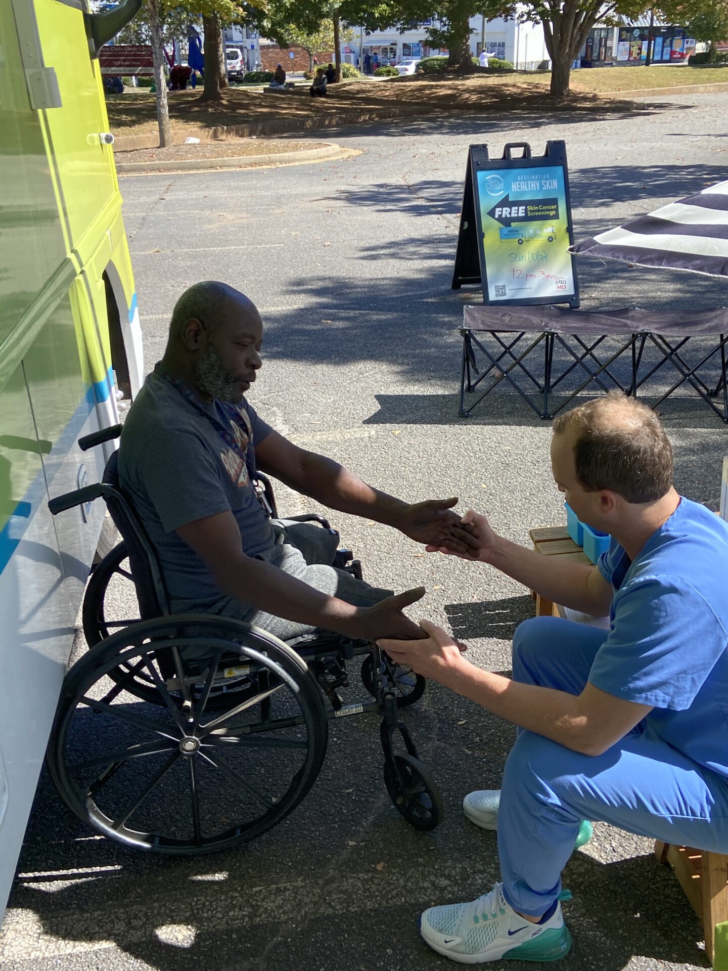 With Fall in full swing, the RV rolled into North Carolina, spending three days in downtown Raleigh with both longtime and new dermatologist volunteers. Many participants were happy to give themselves peace of mind about concerning spots on their skin, but some came out of their screenings with follow up plans — one woman who underwent a screening with Carol Trakimas, DO, left with an appointment scheduled for a biopsy on a suspected basal cell carcinoma.