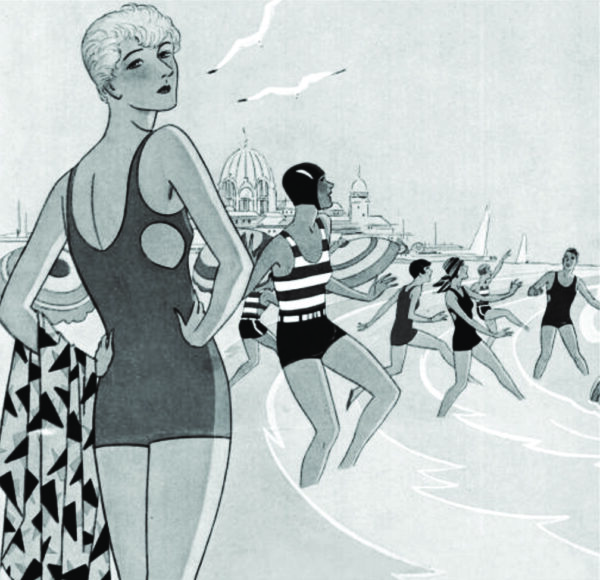 Advertisements followed suit, too. In 1927, a swimsuit advertisement showed women covered up on beaches, wearing hats and holding parasols. By 1929, ads from the same company showed women splashing in swimsuits without any of the protective accessories. That same year, Harper’s Bazaar ran a story titled “Shall We Gild the Lily? There is a Technique to a Good Tan — Whether by Fair Means or Fake!” Tan skin was in.