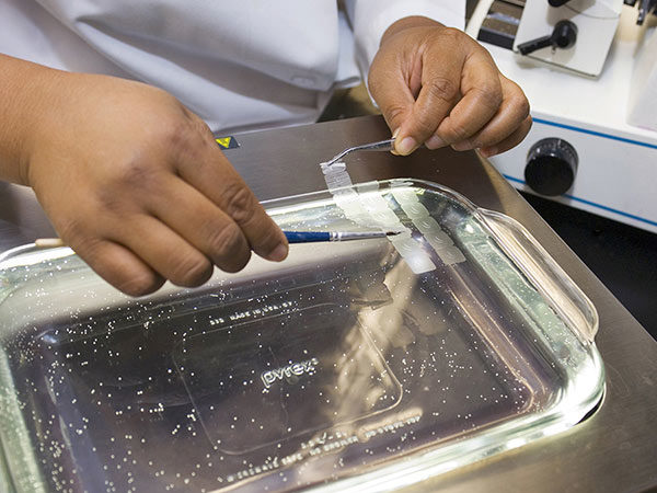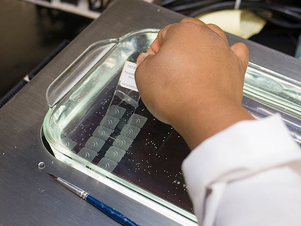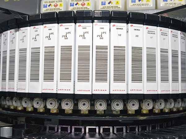 Ever wonder what happens to that little piece of skin after it’s removed from your body? The tissue, which has been “fixed” so it doesn’t change or degrade, is transported to the lab in a small jar or bottle. It can stay at room temperature and doesn’t need to be refrigerated. Once at the lab, it is logged in, and the specimen goes through several steps of processing to help the dermatopathologist analyze it under a microscope to determine a diagnosis. See our slide show. (Lab photos courtesy of Yale Department of Dermatology).