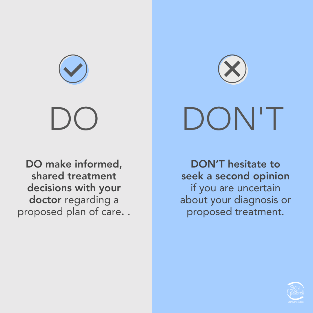 - Ask questions. When speaking to your doctors, take notes and make sure that you fully understand your treatment options. Ask about surgery, whether you will need a plastic surgeon, treatment side effects and what to expect during recovery. Check our Do’s and Don’ts for Skin Cancer Patients for more helpful tips.