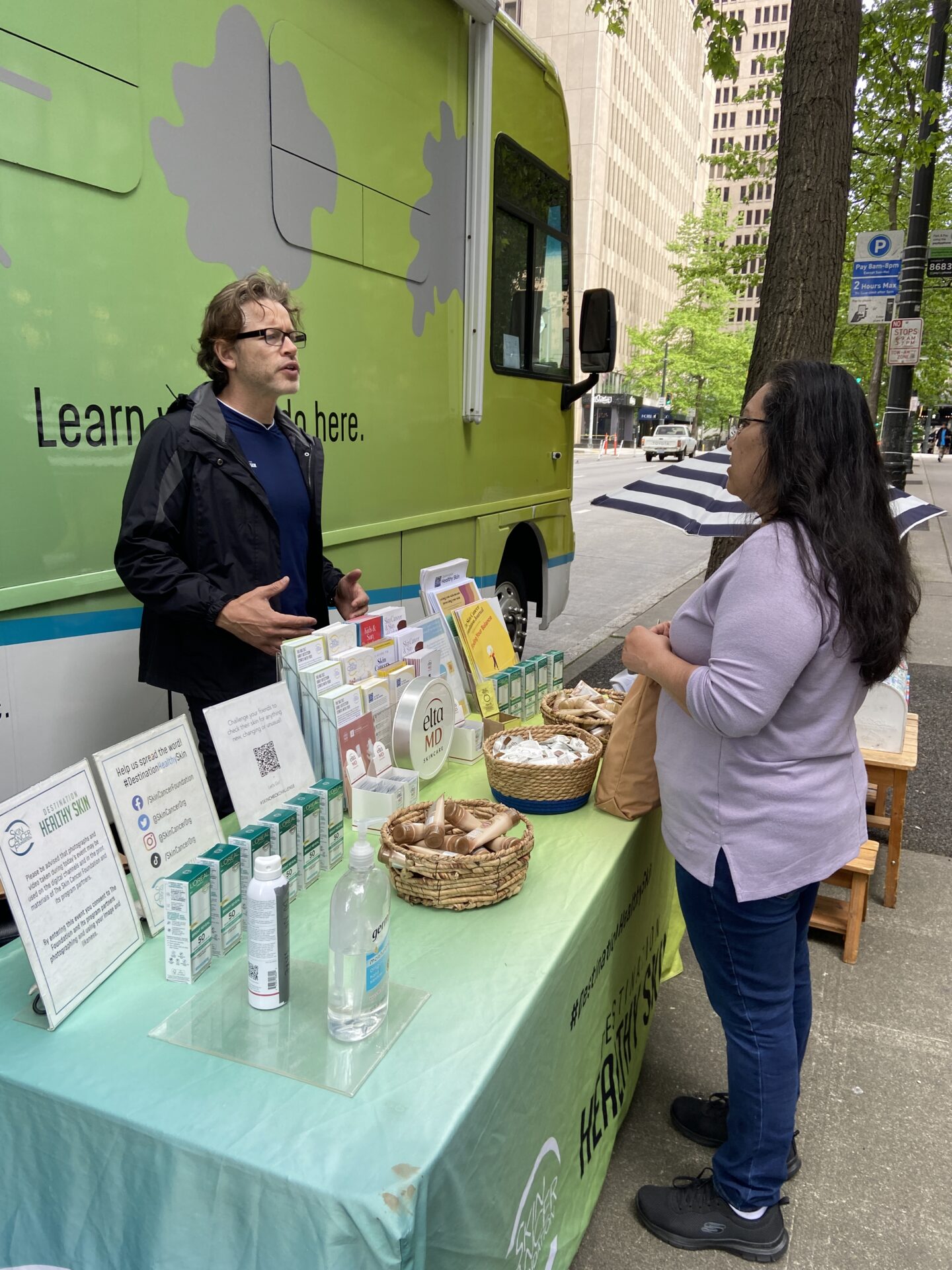 - One of our DHS event managers explains talks about the importance of sun protection with a participant in Seattle.
