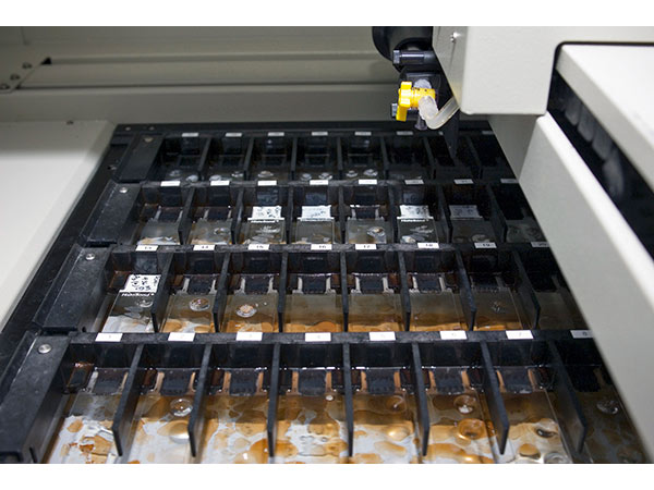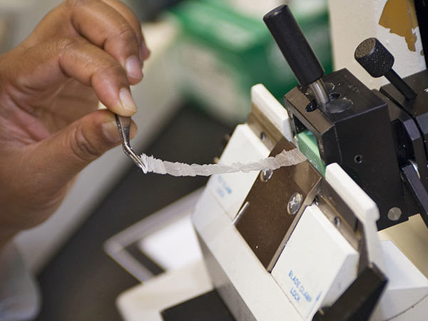 Ever wonder what happens to that little piece of skin after it’s removed from your body? The tissue, which has been “fixed” so it doesn’t change or degrade, is transported to the lab in a small jar or bottle. It can stay at room temperature and doesn’t need to be refrigerated. Once at the lab, it is logged in, and the specimen goes through several steps of processing to help the dermatopathologist analyze it under a microscope to determine a diagnosis. See our slide show. (Lab photos courtesy of Yale Department of Dermatology).